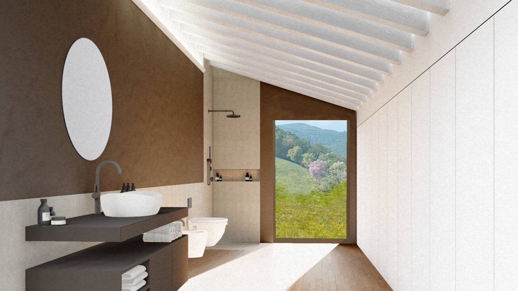I soffitti con travi a vista nella zona giorno aggiungono calore e carattere, creando un ambiente raffinato e accogliente. Il piano primo ospita la zona notte con quattro camere matrimoniali, due delle quali con bagno padronale, oltre a un terzo bagno dedicato alle altre stanze.